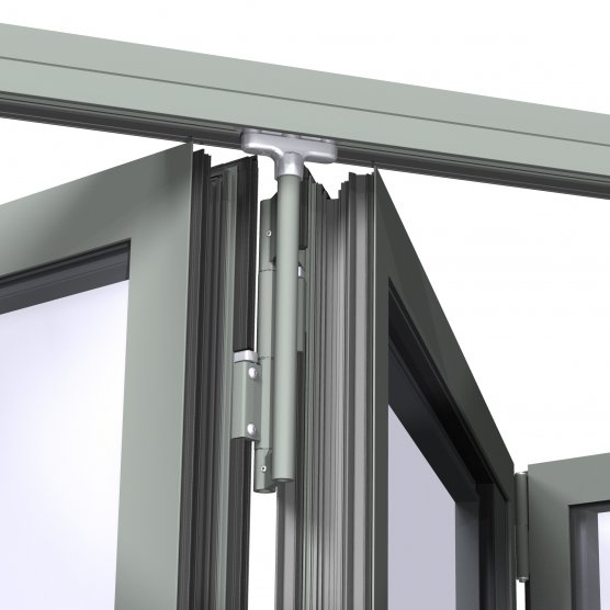 In the CF77 system threshold, a trolley (the guiding mechanism of folding door sashes) moves, transferring the weight of the movable structures. In folding constructions based on window systems, the trolleys move on guides screwed frontally to the frame.